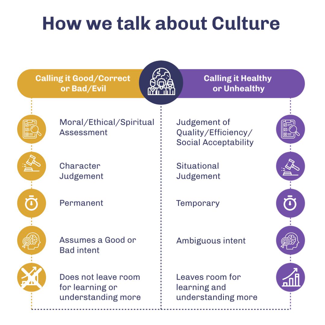 It is helpful to call culture “healthy or unhealthy” when talking about different aspects of it, since there are so many moving parts of culture. Using the terms “good” and bad” can be ambiguous as to your meaning. Good can mean healthy, or good can mean the correct or right way of doing something. Bad can mean unhealthy to some people, while to others it means the evil of wrong way of doing something. Culture is such a large scope of things in our lives: the majority of which is open to interpretation, and not a moral judgement. There are definitely times when how we do life is unhealthy or even needs to be called out as wrong and evil, but that is rarely, if ever, about someone’s WHOLE culture. Culture is mostly healthy or unhealthy depending on the interpretation/intent/character of the individual.